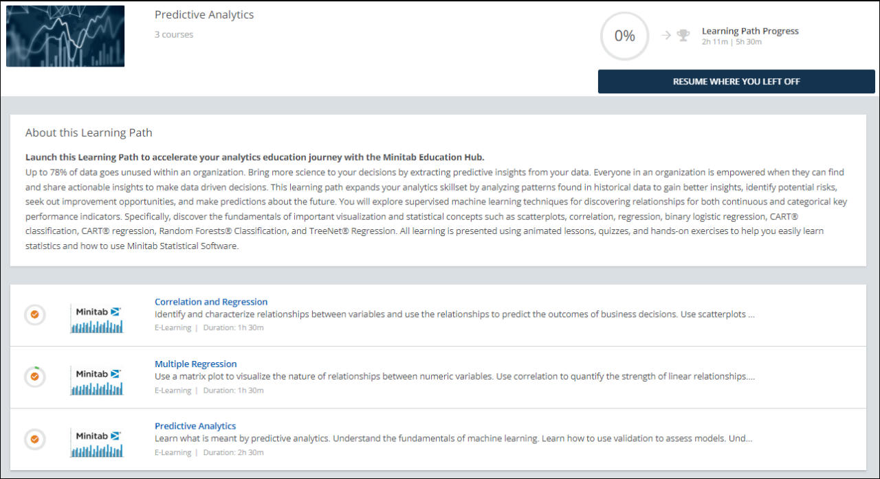 Minitab también tiene el compromiso de apoyar el crecimiento de sus empleados al colaborar estrechamente con usted, ofreciendo asesoramiento, cuando sea necesario, y actualizando periódicamente los materiales para proporcionar nuevos cursos de capacitación y rutas de aprendizaje que amplíen el conjunto de habilidades de sus trabajadores. Ya sea que esté desarrollando a los empleados menos experimentados o mejorando a los más capacitados, las rutas de aprendizaje dirigidas de Minitab ayudan a los participantes a seguir avanzando hacia el logro de sus objetivos, mientras que los tableros de control intuitivos proporcionan a los líderes insights detallados sobre el rendimiento y la utilización.